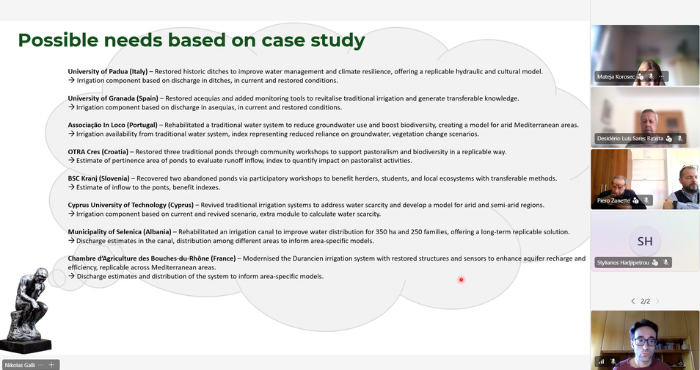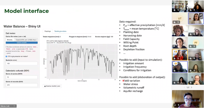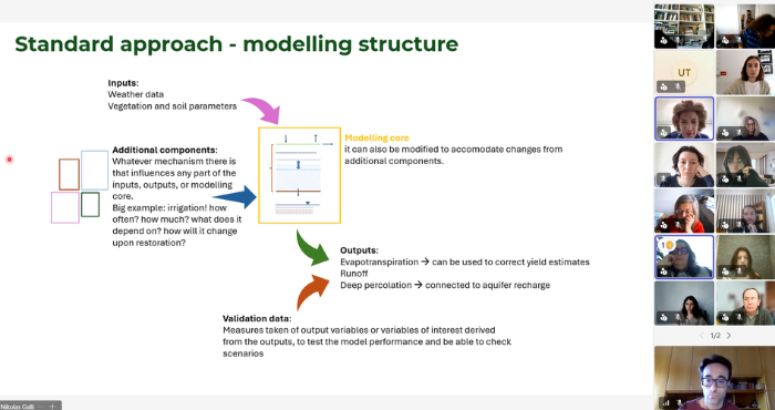 We successfully held our meeting on Monday 23 March 2026, where Nikolas Galli, hydrologist from Politecnico di Milano, presented the project’s hydrological model. Participants were introduced to the modelling framework, its functionality, potential outputs, and how it can support adaptation strategies across different case studies. The session marked the beginning of an interactive co-construction process of the model with valuable feedback collected from all partners on input data and model application, towards drafting a protocol for its implementation and replicability.